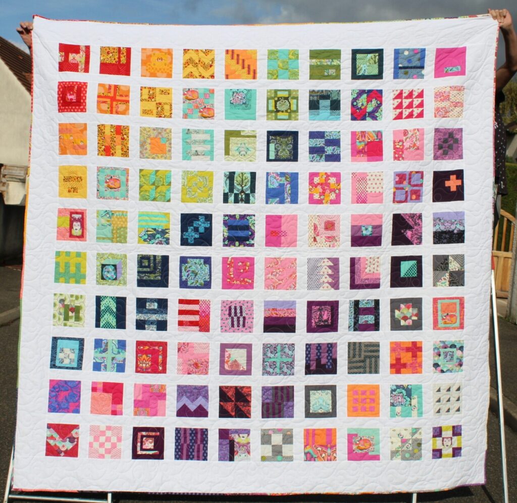 Je reste très fière d’avoir organisé avec Delphine, un quilt along, sur le modèle 100jours100 blocs de Tula Pink en 2017! On s’est retrouvé avec une communauté nouvelle très sympa sur instagram pour faire du modern quilt. Un beau moment!